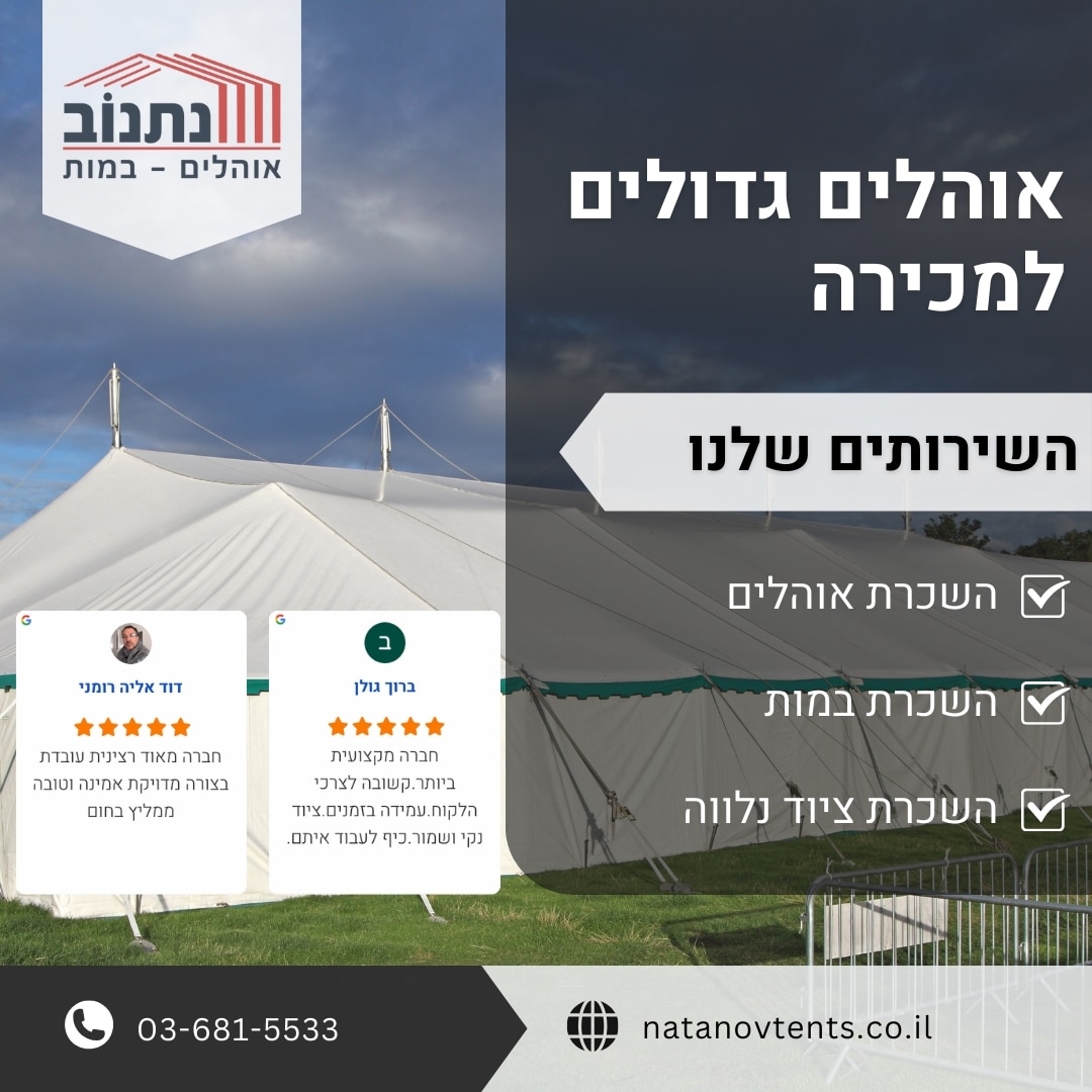 עד היום היה מקובל שאוהלים גדולים מסוגים שונים ניתן להשיג בהשכרה בלבד. אולם כיום חברת אוהלי נתנוב מאפשרת רכישה של מגוון אוהלים גדולים ואיכותיים העשויים כולם מחומרים בעלי עמידות יוצאת דופן ורמת גימור גבוהה ביותר.