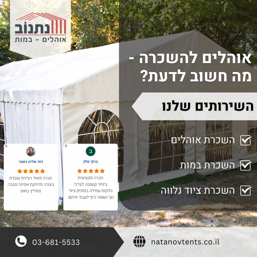 חברת אוהלי נתנוב מתמחה באספקת אוהלי איכות למגוון אירועים. החברה מזוהה עם השמות הגדולים של ספקי האוהלים לאירועים כאן בישראל והיא מציעה שירות מקצועי, אמין ויעיל גם באספקת ציוד נלווה כמו במות, מחסומים וגדרות ופתרונות מיזוג אוויר לאירועים. רוצים לשכור או לקנות אוהל בהתאמה אישית לצרכים שלכם? חברת אוהלי נתנוב תדאג למלא את הדרישות שלכם על הצד הטוב ביותר כדי שתיהנו ממוצר איכותי מושלם. להזמנות חייגו: 03-681-5533.