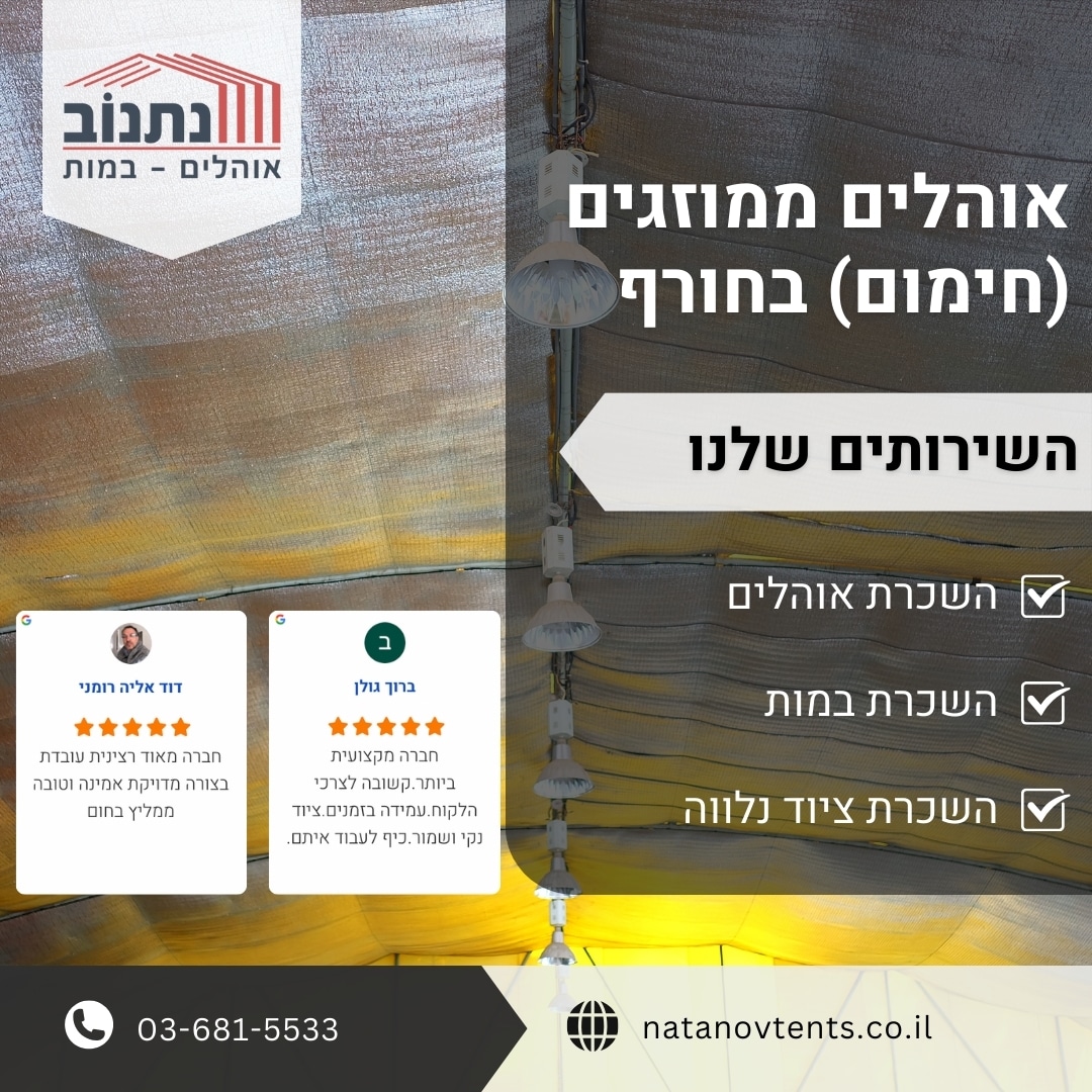 כשמדובר באירועי חוץ, במיוחד בעונת החורף, חשוב להבטיח חוויית אירוח חמה ונעימה עבור האורחים שלכם. אוהלי נתנוב מתמחים באספקת אוהלים ממוזגים המשלבים טכנולוגיות חימום ומיזוג מתקדמות, המתאימות בדיוק לצרכים שלכם. אוהלי החברה מצוידים במערכות חימום יעילות כמו תנורי אינפרא אדום או מפזרי חום חזקים, שמבטיחים פיזור חום אחיד ונעים בכל שטח האוהל. בנוסף, מערכות האוורור והבידוד התרמי שומרות על הטמפרטורה האידיאלית, תוך חסכון באנרגיה ומקסום הנוחות. בין אם מדובר באירוע עסקי או מסיבה משפחתית, עם אוהלי נתנוב תיהנו מאירוע חורפי חם ובלתי נשכח, בכל תנאי מזג האוויר.