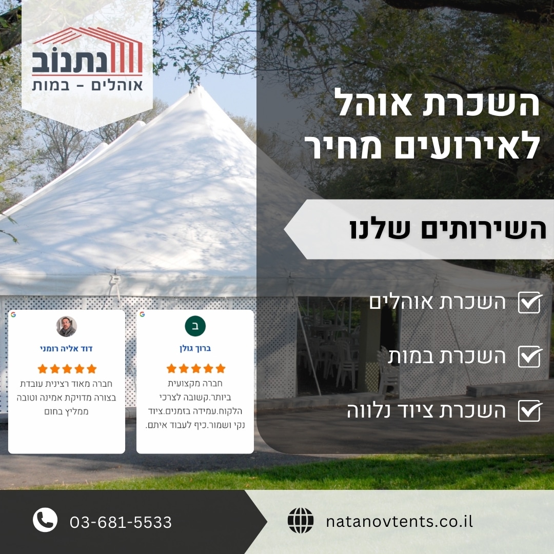 - ממחיר של כ1000 ₪ לאוהל קטן יחסית עבור פרק זמן השכרה קצר. לרוב, אוהלים אלו לא יורכבו על ידי צוותים מקצועיים.